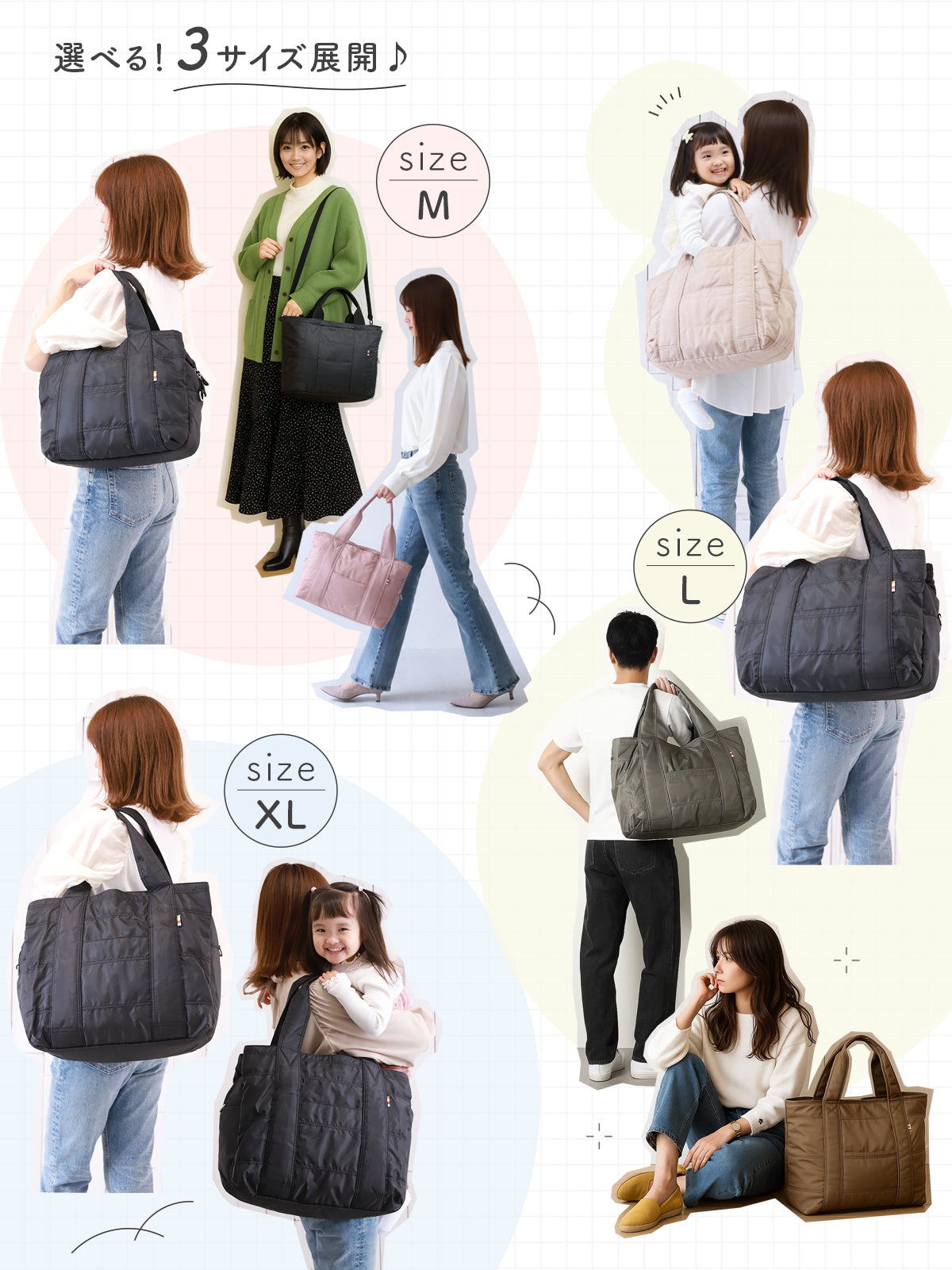 Mサイズは日常使いに、Lサイズは荷物が多めの方やお出掛けに、XLはご旅行や陣痛バッグにおすすめ。