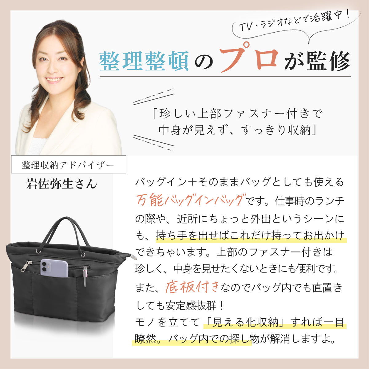 モール購入者様 大きなファスナーのない通勤バッグにピッタリでした。バックインバックの真ん中にファスナーがあるタイプが欲しかったのでよかったです。