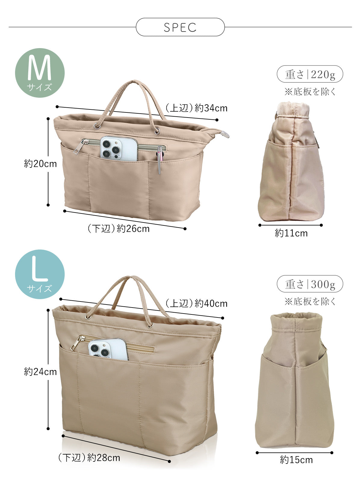 | サイズ | Mサイズ:縦 約20cm / 上辺 約30cm / 下辺 約26cm / マチ 約11cm Lサイズ:縦 約24cm / 上辺 約40cm / 下辺 約28cm / マチ 約15cm |