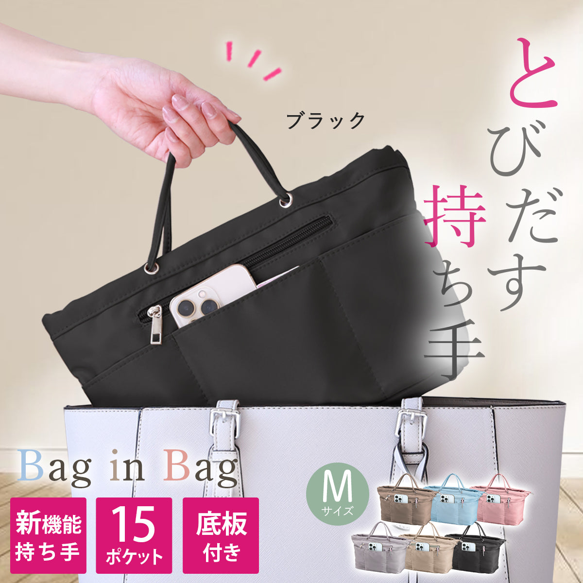出し入れ可能な持ち手を搭載した、多ポケット設計のバッグインバッグ。